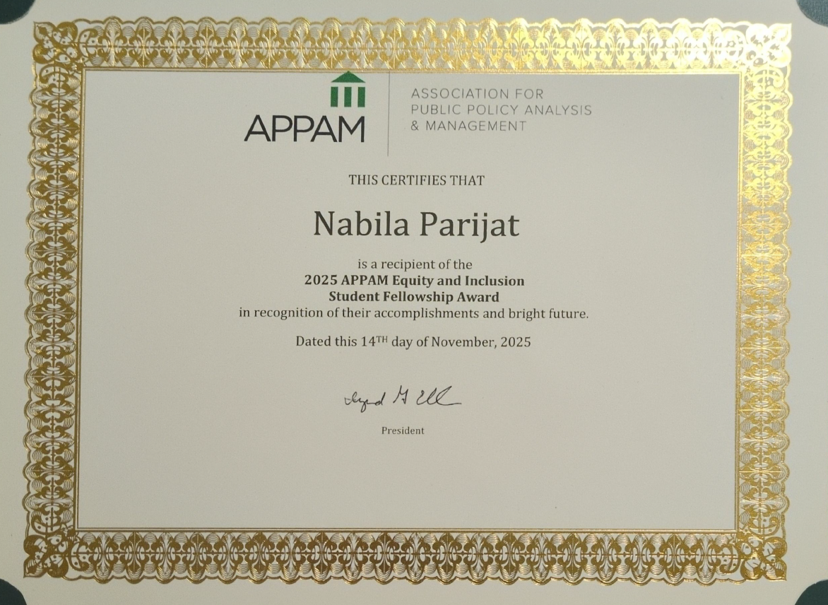 Hi! I’m Nabila Parijat, a PhD candidate in Public Affairs at the University of Texas at Dallas. I expect to complete my dissertation by May 2026 (fingers crossed!). An international student from a small developing nation, I am passionate about research areas that affect nonresident aliens at a deep level - immigration policy and international development.